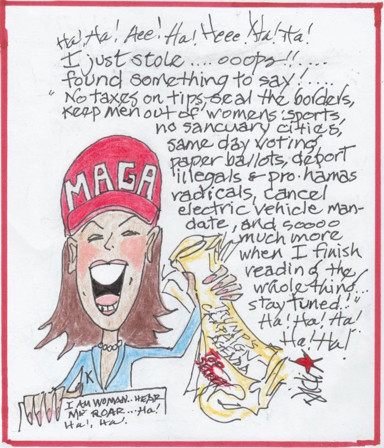 That’s what we’re witnessing with Kamala Harris. She’s acting and reading the lines for her science fiction movie. I’ll give it to her, she’s a good actor. She’s sticking to the script; read what’s in front of you and stop cackling.